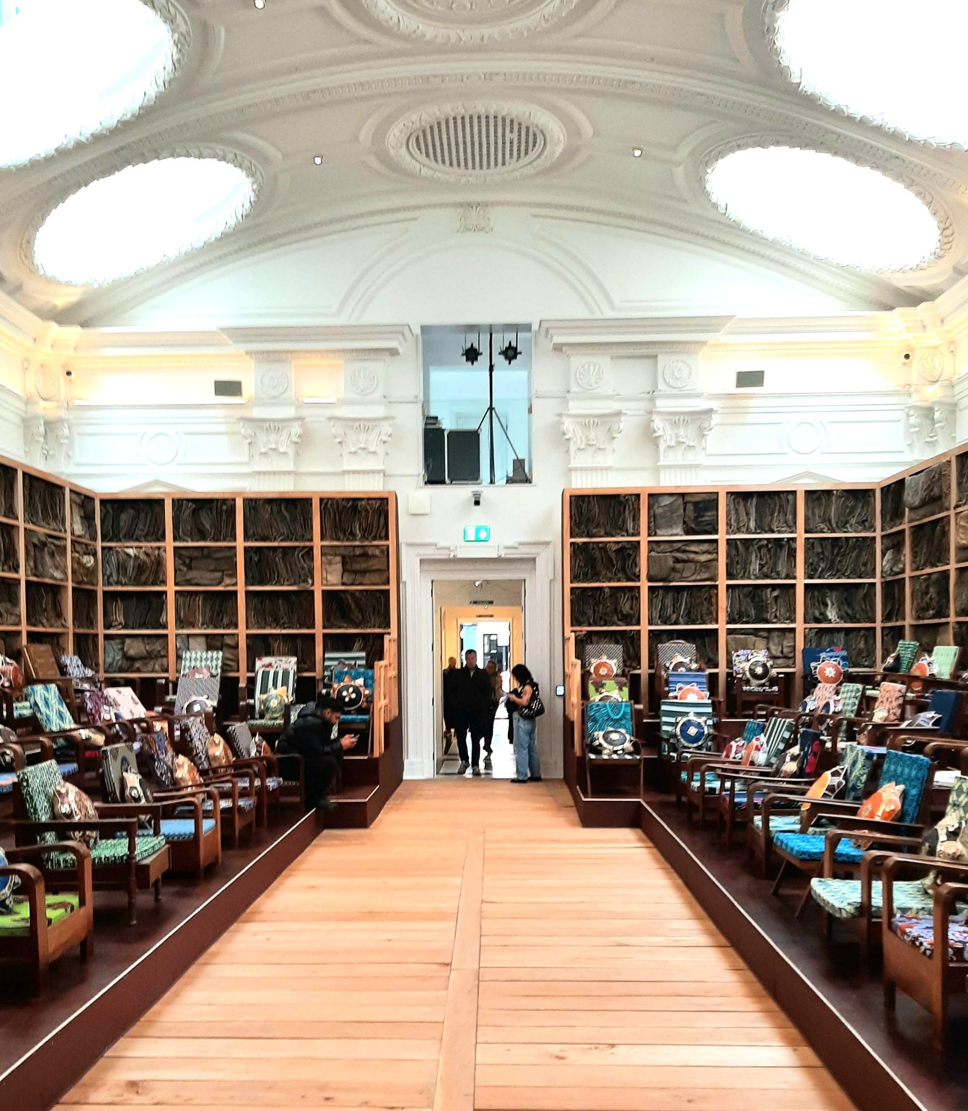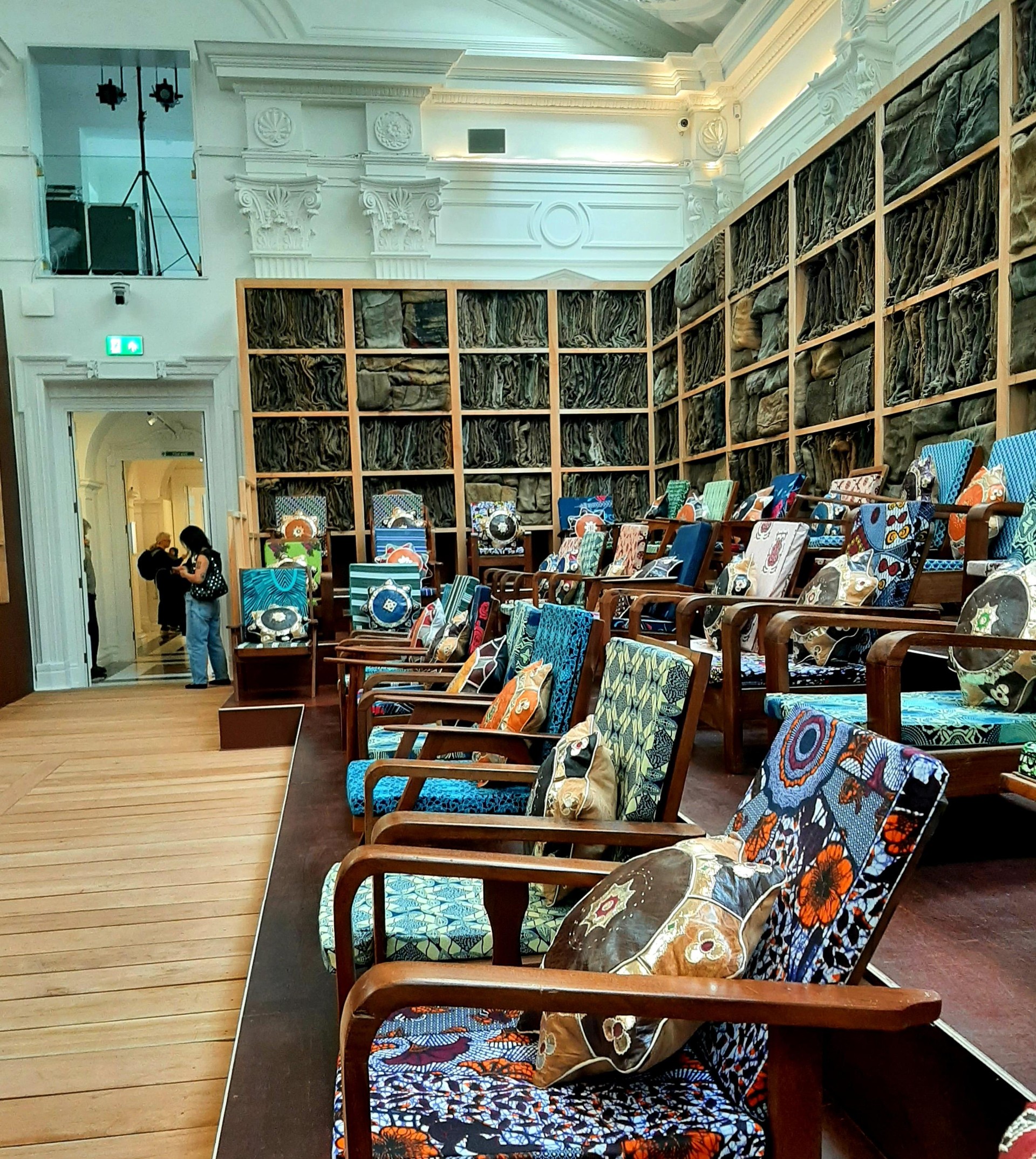 Seventy-five chairs, contributed by households across Ghana, are arranged ceremonially around a large neo-Baroque hall, in what amounts to a stage set for a parliament whose members have suddenly disappeared. Wooden armchairs, Mahama points out, were once “signifiers of authority within patriarchal structures”. In Ghosts the chairs’ upholstery is made from textiles bought by the artist at a local market near to his studio in Accra, and leather from the same source provided covers for the cushions. The shelves which enclose the parliament are packed with folded jute sacks, symbols of the overseas trade that underpins political power. Parliament of Ghosts, says Mahama, doesn’t just represent the flaws of Ghana’s government, but is intended to highlight the failures and unfulfilled potential of parliaments around the world. By bringing the piece to London, he is performing a kind of “reverse restitution”. Rather than campaigning for the return of objects to Britain’s former colonies, he is transferring the colonies’ material histories to the capital of their former rulers.